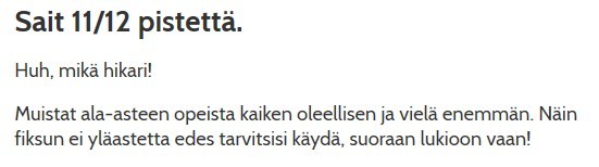 Ihan hauskoja tuollaset tietotestit. Kolme kertaa kokeilin (aina eri kysymyssarjat). Ensinmäisen kerran pisteet 7/12, ja seuraavilla kerroilla 8/12. Äidinkieli, historia ja maantieto tuottivat ongelmia, kuten kouluaikanakin.