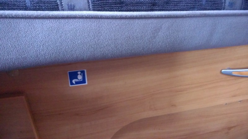 No ei meillä vyöpaikoilla tarroja ole, ainoastaan tuossa sivusohvalla josta toisella paikalla on tuo tarra. No eihän tuo sivuttain istuminen mitään valkoihoisen hommia ole, ei siinä kukaan kauaa ole viihtynyt. Monia on oikein pahaa olo iskenyt..