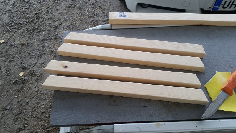 Istuinryhmän muokkaus ihmisen kestäväksi höylättyä 21x32mm rimaa vahvikkeeksi.  Paino ei lisääntynyt kun parin kahvipaketin verran mutta nyt nuo istuimet on sellaiset että aikuinen voi niin istahtaa ilman pelkoa että koko penkki leviää alle.