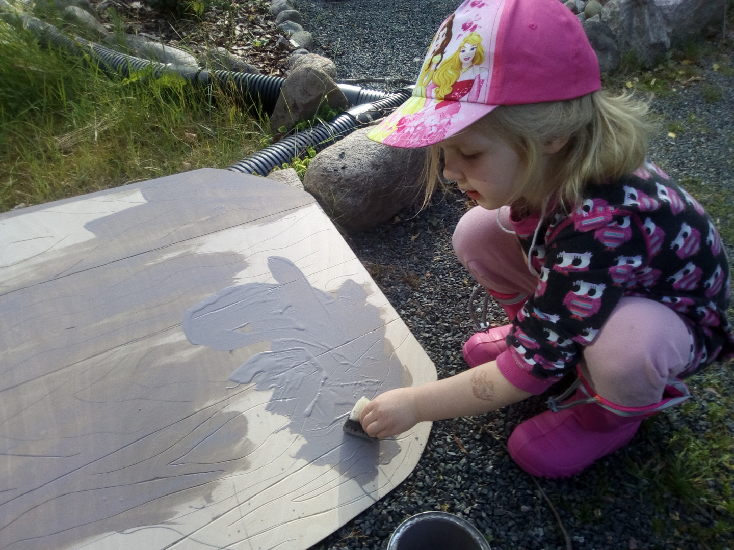 Isi leikkas 1v4kk piirteli kuvioita mitä isukki sit lisäili 4v piirsi suorat "lankkujen rajat" ja maalaus vastaava äiti kaiversi osan  vielä jatkellaan maalailua