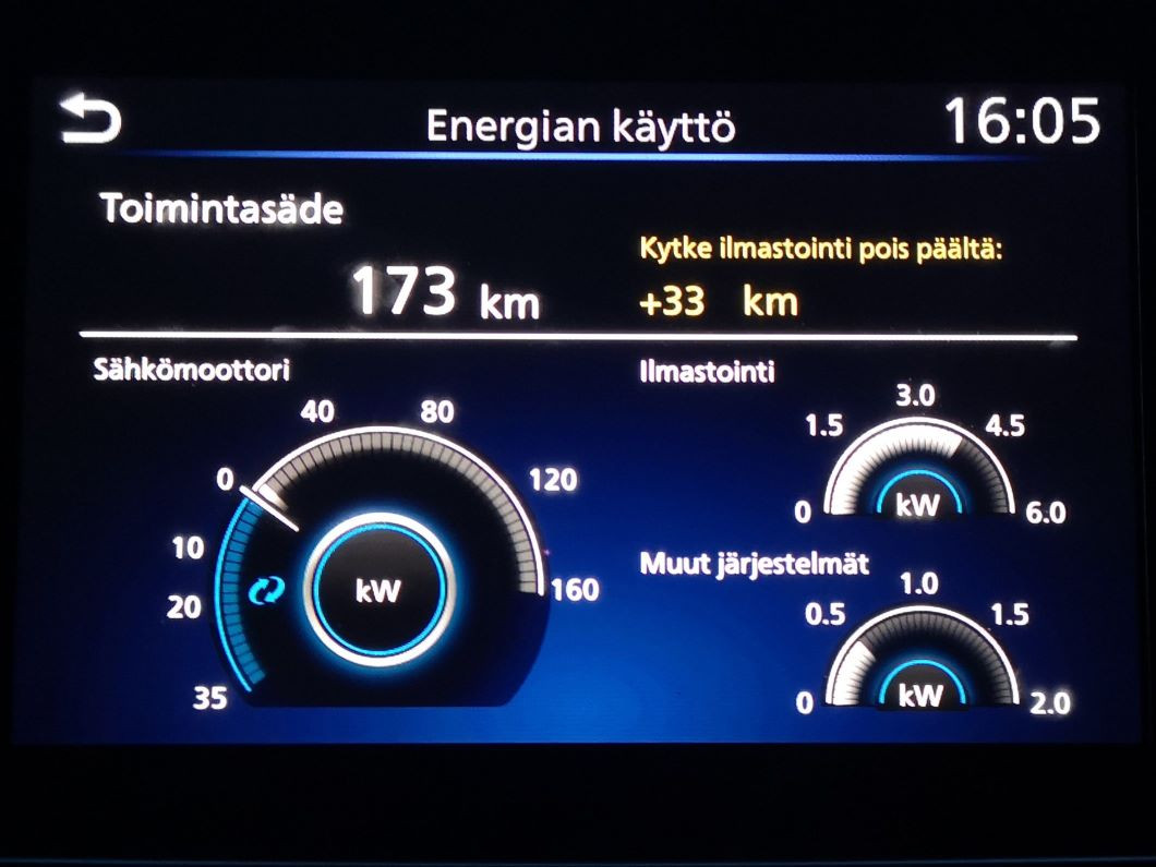 Lähtötilanne: lämpötila -16C akku 100% range näyttämä 192km (auton sisätilat esilämmitetty latausjohto kiinni)