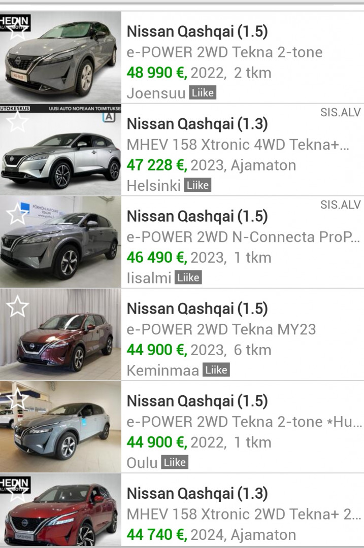 Omat ajoni lienevät nykypäivänä luokkaa 25tkm/v ja vuodessa ei montaa päivää tule ettei yksi kotipiuhasta ladattu akullinen päivämatkaan riittäisi - kovimmilla talvikeleilläkään - joten sähkö olisi mun ajoihin aivan nappivalinta. Ei kuitenkaan kyseinen Nissani, mutta sähkö noin ylipäätään. Mutta koska mun käyttis jo pitkään ollut 'rämä mutta oma ja kokonaan maksettu' eikä polttoainekulujen ja pakollisten maksujen lisäksi pyydä mitään edes joka vuosi niin mun on kuitenkin edullisinta jatkaa sillä.
