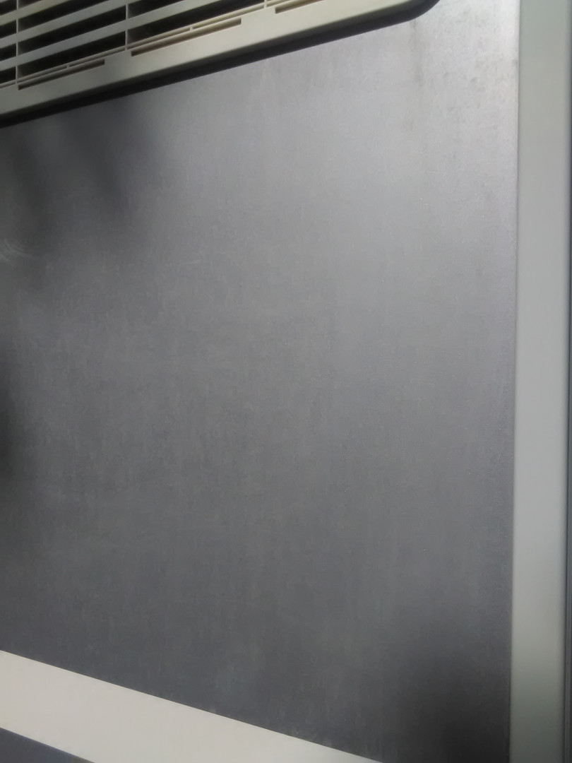 Yritin kuvata,mutta hieman hankalaa. Haalistumat näkyy kuitenkin hiukan kun tarkkaan katsoo.  Muualla hieman pahempia paikkoja esim.ikkunoiden alla jossa pintaan jäänyt vaaleita valuma jälkiä.