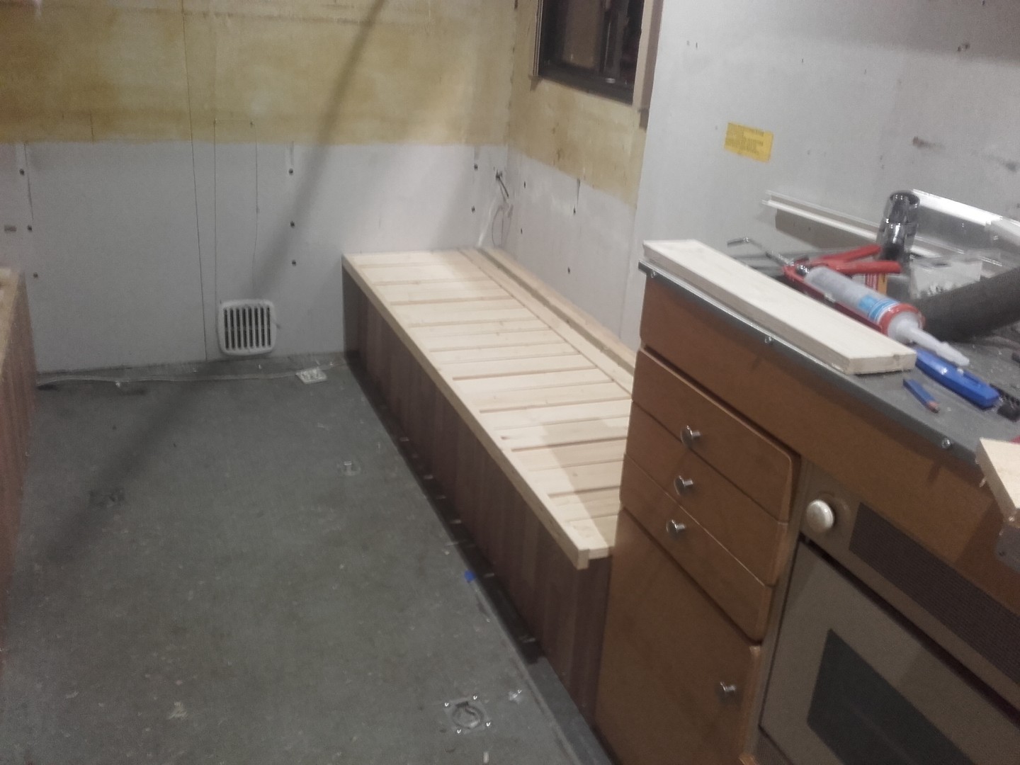 Etureunaan vaneri joka käsitellään (jollain?). Sitten kun levittää istuimet niin saa kaksi erillistä 90 sentin sänkyä tai koko systeemi yhdeksi niin pääsee parisänkyyn rouvan kanssa.. Etuseinään kehittelen jonkunlaisen pöydän kiinni joka taittuu kahdesti ollen joko pikkupöytä tai iso pöytä  ::)