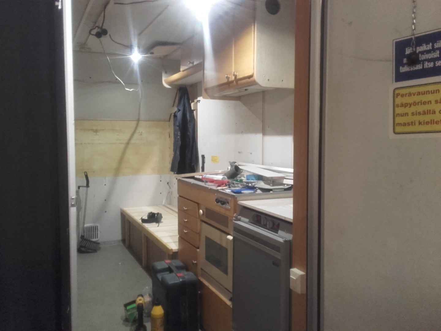Siihenpä se nyt jäi, talviloma on lusittu  ???  Vanha kafivaunu luovutti vielä viimeisen palasensa ja tein jääkaapin alle saranaluukin entisestä vain sahailemalla ja rälläkän virsikirjalla pyöristelemällä  ;D