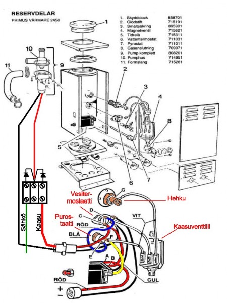 Voin laittaa mutta vasta illalla. Se on semmoinen aika iso sininen johon tulee sekä 12 v että 230 volttia. 12 voltin päähän tulee kolme johtoa(joista nyt yksi on vissiin toi sähkölämmitys ohjauksen johto) sen jälkeen on jokin diodi paketti. 230 voltille tulee pistorasian kautta virta. joka sitten muistaakseeni taas menee jotenkin tuon diodipaketin kautta. Eilen käytin pannua auki ja siellä ei pumppu näkynyt. Sekavasti selitetty..:)