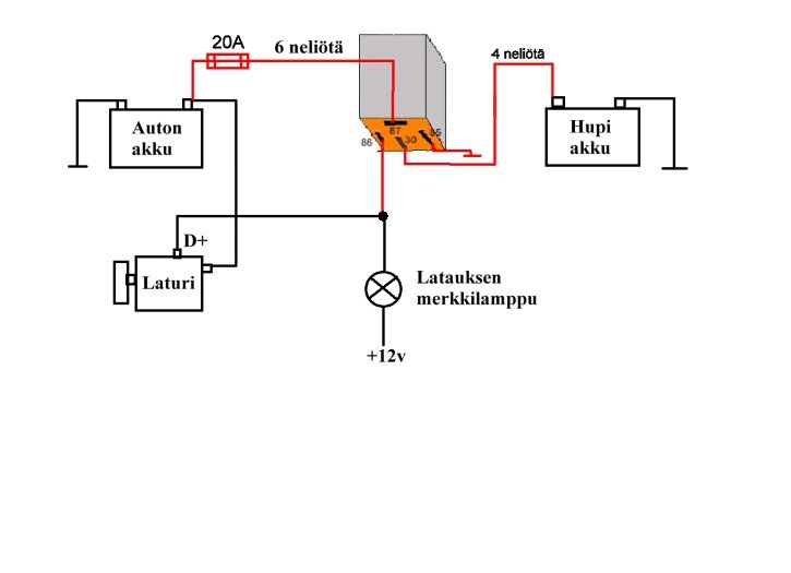 Hupiakun lataus laturista on ilmeisesti yleensä kytketty automaattireleellä joka kytkeytyy päälle kun auton käynnistää? Saisinko yksityiskohtaiset ohjeet tälläisen kytkentään, ja osiin mitä tarvitaan.