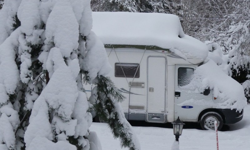 Täällä turkki tarvitaan, koska mobiilia ei käytetä talvella. Jyrkkä harjakatto, koska lunta tulee runsaasti (talvella). Työnnän tuon itsetehdyn kehikon katolle  ja leväytän pressun (kevytpeite) päälle pitkällä kepillä (yksin). Kehikko on hieman leveämpi kuin kori, jolloin samaisen kepin voi työntää pressun alle kulmalistaan tukien ja ravistella lumen pois (suvikelillä).