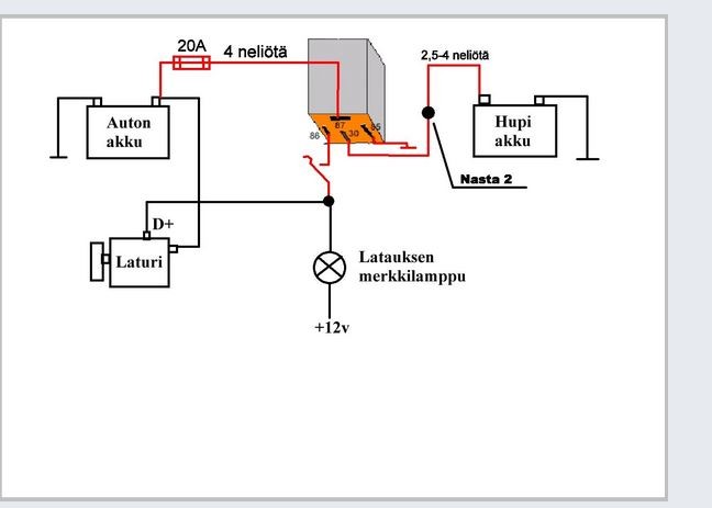 Tuohon vaunuun tein mjo:n ohjeen mukaan, paitsi että otin virran laturin B +navalta jolloin jää pari-kolne liitosta pois, johdoksi 6 neliön, releeksi 70 A.. Sulakeita en tarkasti muista varmaan 30 A., (pienemmät taisi palaa, kun akussa oli tilaa), lähelle hupiakkua ja laturia (jotta sulakkeeton johto lyhyt) siis kahdet. Tuossa yhdistelmässä lataukseen on vain vähäinen vaikutus kierrosluvulla, tai onko ajovalot (H4) päällä tai ei. Opelin akku on riittävästi latautunut vaikka hupiakut on olleet suht. vajaita.