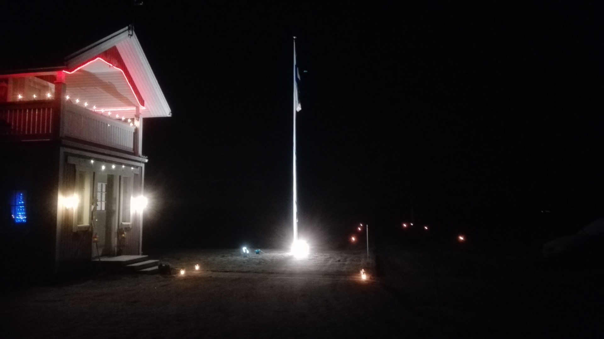 Nauttimassa valoista. (Kuva piiloitettu, klikkaa tätä niin näet kuvan.)On tuo Lakeuren Risti vaan komia! Minilippu tolppaan kuten yleensäkin merkkipäivinä. Led-otsalamppu valaisemaan yöksi vaatimusten mukaisesti. Finlandiaa kuunneltu puhelimen/läppärin kautta. Nämä tärkeimmät jos ei muuta tule.