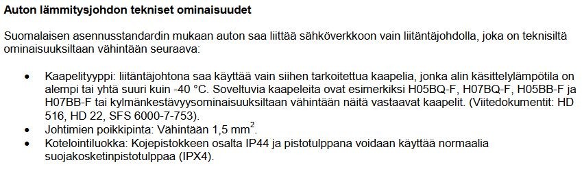 Eipä noita nyt enää kannata lähteä vaihtelemaan. "Mokahan" on jo tehty. Eikä edes sfc:n CEE-liitinvaatimus ole vielä ehtinyt joka kämppärille. Edes Suomessa. Mutta mun on aika vaikea hahmottaa mitä laajempaa hyötyä on pakolla laittaa joka paikkaan kausikämppäreillä 16A johdonsuojat, kun liki kaikille riittäisi (kausikämppäreillä!) hyvin 10A ja samalla pärjäisi 1,5 mm 2 liitoskaapelilla. Tulevaisuudessa ehkä tarve? Sähkönkulutusta kyllä pyritään minimoimaan, mutta suora sähkölämmitys nyt vaan ottaa aika 1:1 sen tehon mitä lämmittämiseen tarvitaan. Tämän kaapelin hankinnan voisi ajatella edullisena investointina. Ns. hyväksytyn kaapelin ja siihen vastaavan adapterin saa 40-100:n euron hintaan riippuen hankintapaikasta ja sen tarjouksista. Sen kanssa pärjää kaikilla alueilla ongelmitta. Kaapeli kestää 30-50 vuotta. Vuotta kohden se maksaa n.1-3,5 euroa. Mitä se on esimerkiksi ajoneuvoverojen ja vakuutusmaksujen rinnalla, jotka saattavat yhteensä olla joitakin tuhansia JOKA VUOSI. Lisäksi kun ostaa ns. autonpuoleiseen päähän adapterin CEEuros-shukonaaras sitä voi käyttää kotona jatkojohtona, eikä kukaan huuda perään.