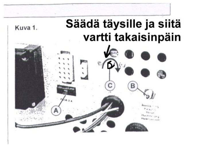 Huoltomanuska sanoo mahdolliseksi aiheuttajaksi liian alhaista käyttöjännitettä, tai kontaktihäiriötä maadoituksessa.
