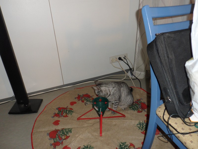 Kissa tutkailee kuusen jalkaa,että voiko siihen kuusen laittaa :D