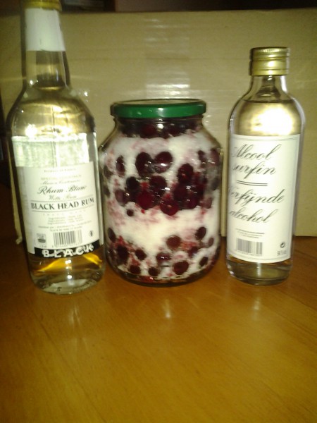 Poimittu isot tumman punaiset viimmeiset pikkaisen ylikypsät kirsikka purkkiin. Sokeri löytyi kaapista, mutta ei valkoista rommia eli kaupassa pitää pistäytyä.