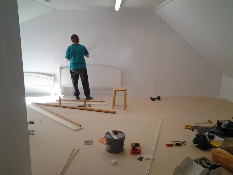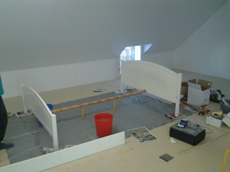 Katsellut vierestä kun vaimo kittaa seiniä ja itse asennan lattialevyjä. Kyllä tuosta ihan hyvä työhuone tulee. Sängylle päätettiin antaa uusi pinta ja pestiin soodalla ennen maalausta.
