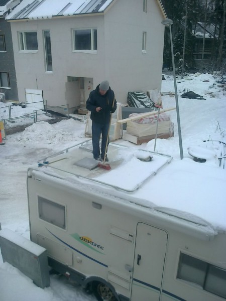 Harkitsin auton siirtoa 2 kerroksen parvekkeen viereen ja sieltä käsin tuon tehdä. Ei vaan ollut sopivaa työkalua siihen niin tein kuten aikaisemminkin. A tikkailta olen joskus hankeen dyykannut, toiste sitäkään en aio tehdä