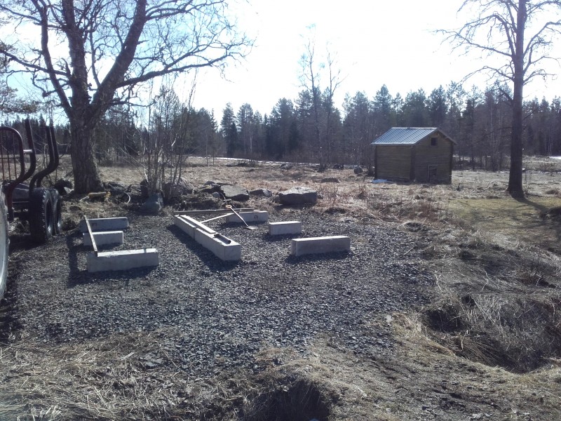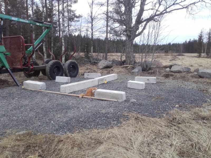 Katkoin pitkiä junttapaaluja timanttilaikalla lyhemmiksi ja heittelin tulevain aitan paikalle ne.. Rakennustarkastaja paikalla..