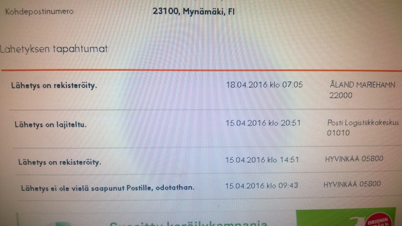 Ihmetelty Suomen postin logistiikkaa  :o ei ihme, jos lähetykset liikkuu hitaasti, kun kiertää Maarianhaminan kautta  :laugh: