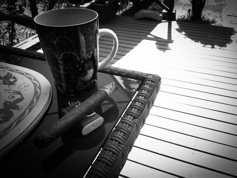 Työpäivän päätteeksi nautin kauniista kesäilmasta, hiljaisuudesta, vasta jauhetusta kahvista sekä pikku sikarista.