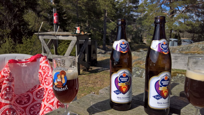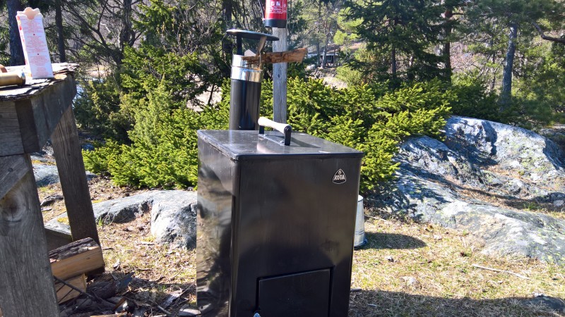 Kysyin pomolta luvan ja poistuimme Kopparöhön. Savukalaa tehdään odottelujuoman kera.