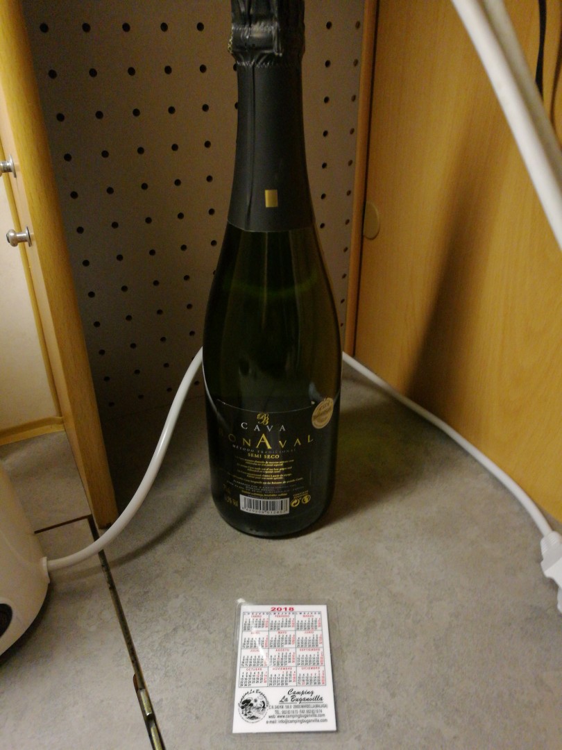 Kiva ele Campingiltä jossa nyt ollaan. Puutarhatuolissa odotti kuohuviinipullo ja jonkin sortin Espanjan lottokuponki kun tultiin kaupungilta tänään.  (lottokuponki selällään kun te kuitenkin nappaisitte mun voitot  ;) )