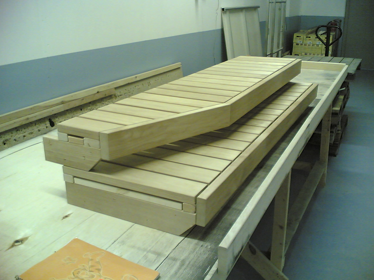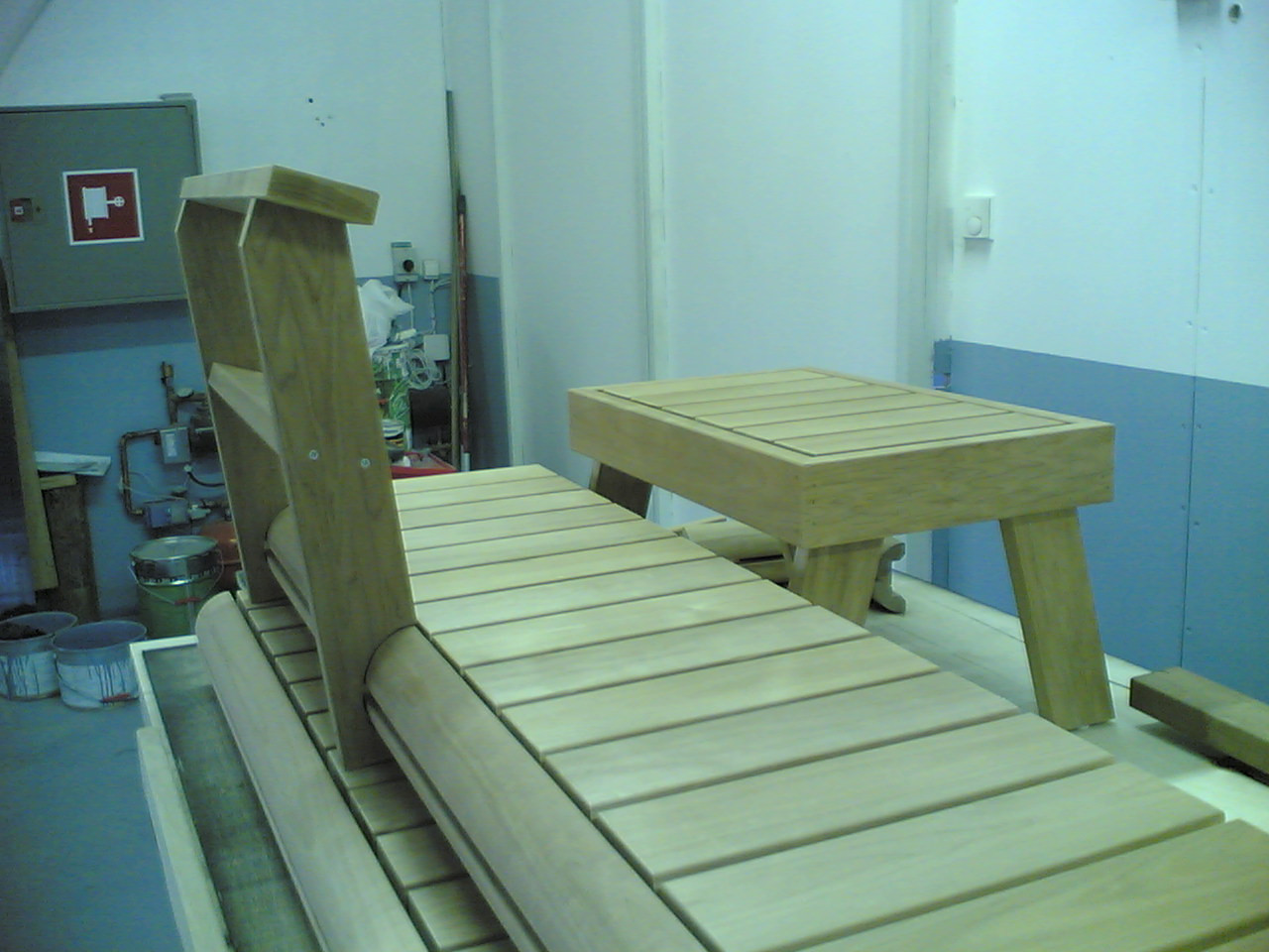 Eihän niitä jaloilla yleensä edes tehdä mutta nuo olikin messulauteet jotka väsättiin nuitten irtoseinien väliin, olis ne roikkunut siinä jotenkuten mutta kun niissä kävi ihmiset koe-istumassa niin ohje oli että pitää tehdä niin tukevat kuin mahdollista ettei tule nitkuvaa vaikutelmaa  :P