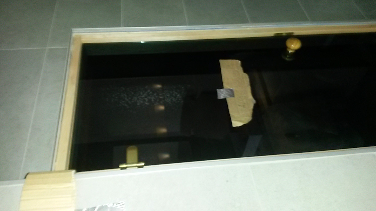 Oven ja kaiteen laitoi. Huomasin samalla, että arkitehti kun suunnittelee, ovi aukko on taas väärässä paikassa. Lasi-ovi kolahtaa hyvin laaatoilla päälystettyyn kulmaan. ;)