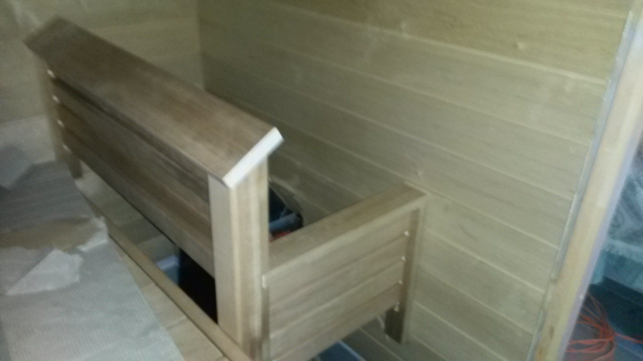 Tehtaalla tehdyt kaiteet saunaan, miltei umpinaiset.