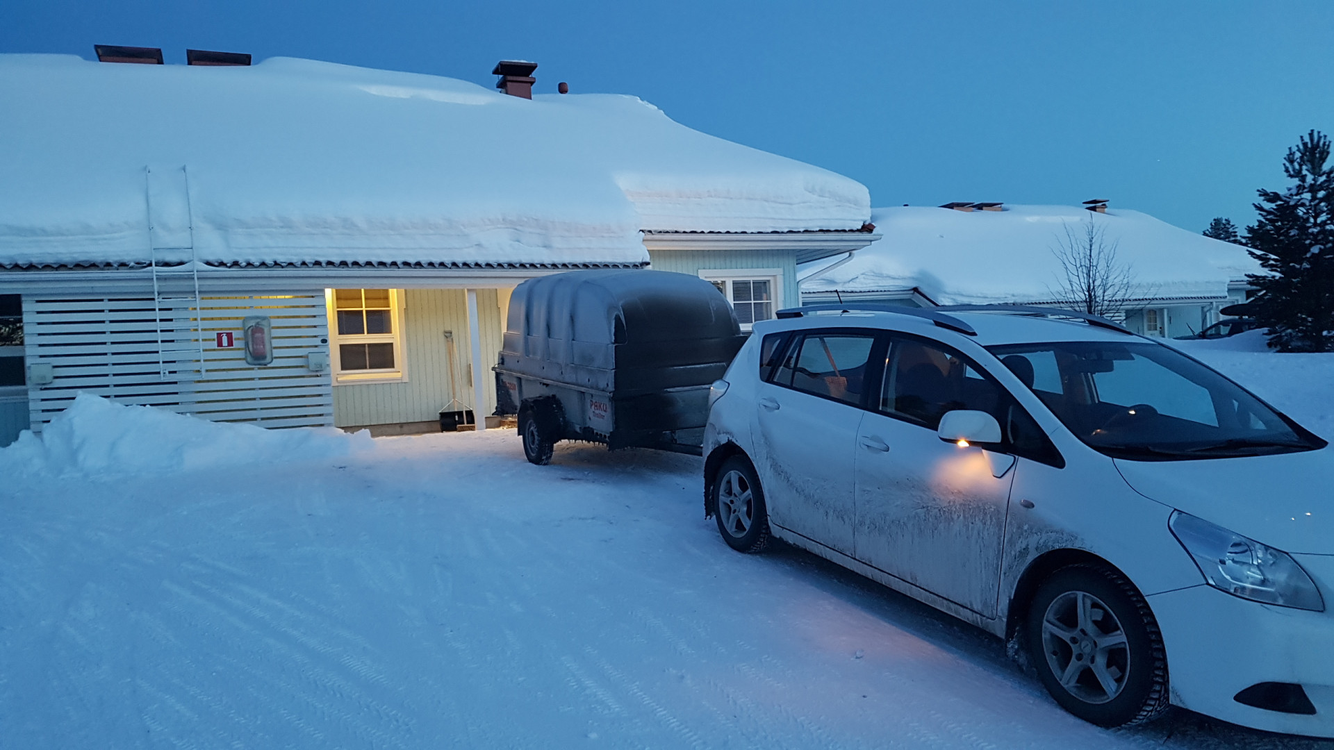 Saavuttu Vuokattiin. Peräkärry imenyt keulaan hieman jäätä.