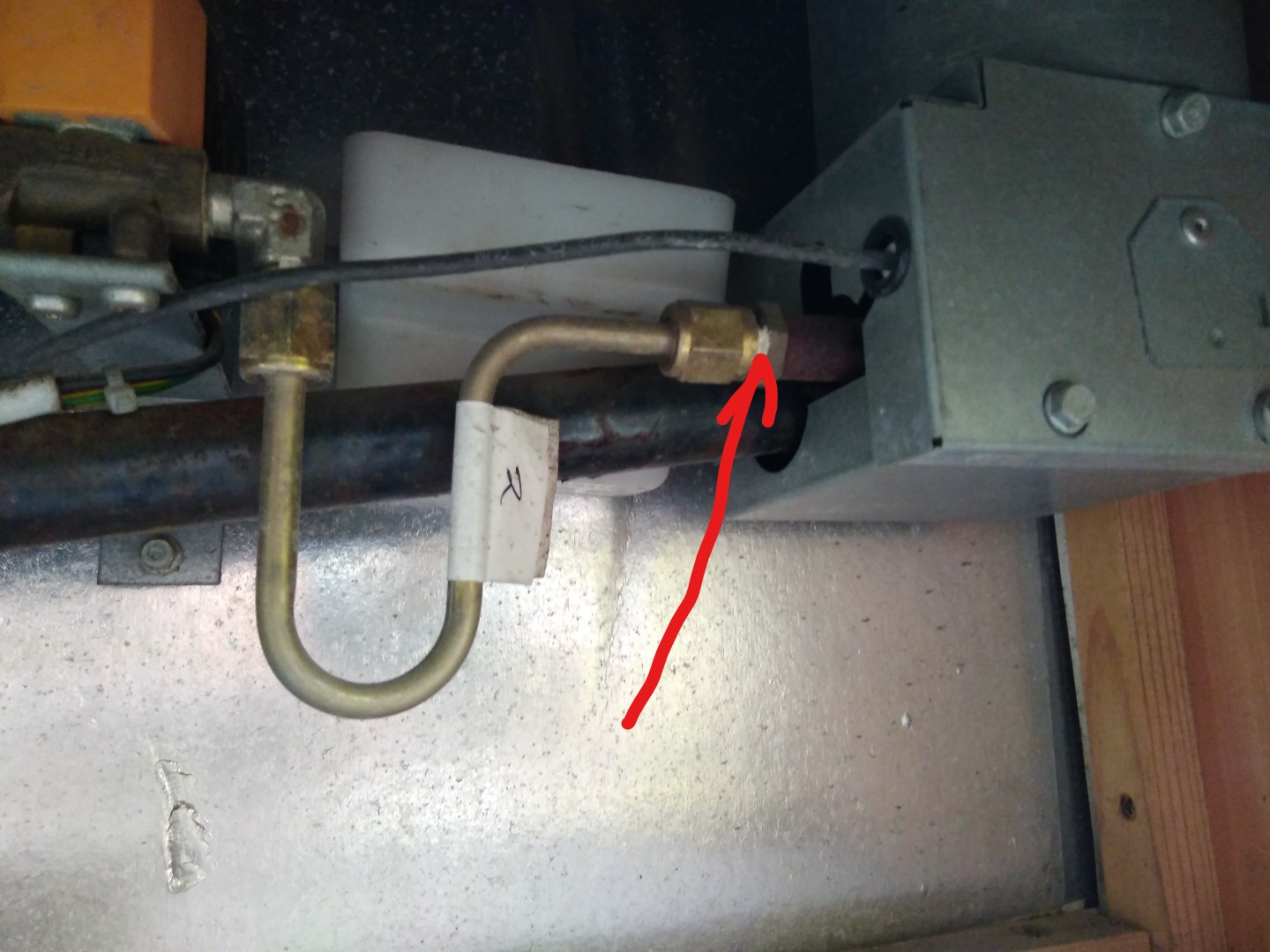 Nuoli osoittaa paikkaa jossa suutin on tulevan kaasuputken päässä polttimon sisällä.