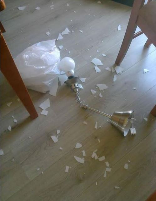 Heti nykyiseen asuntoon muuton jälkeen ostettiin muutama valaisin Ikeasta, pari lukuvaloa ja yksi katto. Lukuvaloista toinen vaihdettiin uuteen muutaman kuukauden jälkeen kun lakkasi toimimasta ja kattovalaisimen ripustus kesti 9kk, sitten valaisin rysähti lattiaan omia aikojaan. Kattovalaisin oli vaimon työhuoneen yleisvalaisimena ja huoneessa paljon tekstiilejä jotka oli täynnä lasinsirpaleita.