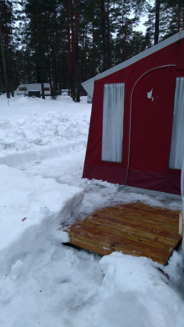 Aloitin vaunun paikan putsauksen. Noin 70cm on meillä lunta  tasaisella.