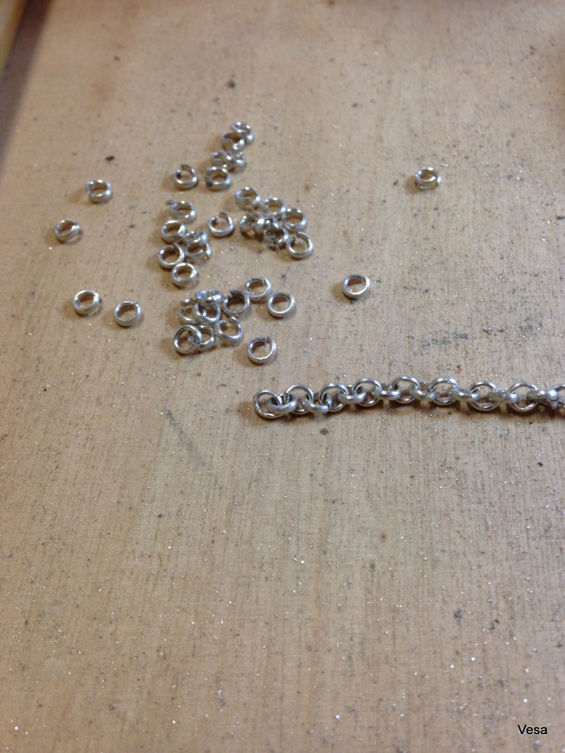 ![]() Ensimmäiset hopeaketju harjoitukset.Eikös olekin mukavaa hommaa? Hermo lepää kun ketjua tekee. Saatko jo lenkin naksahtamaan kun suljet sen? Töitä, vaan nyt keittiön pöydän ääreessä ruissipsejä erilaisilla päällysteillä ja punaviiniä.