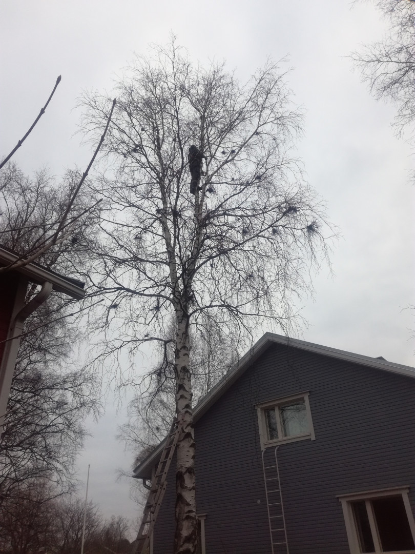 Pari isoa koivua kaadettiin pihalta,ketterästi meni kaveri koivun latvaan,meikäläisestä ei enää ole menijäksi :(.Polttopuuta tulee mukavasti,ja oksia ;D
