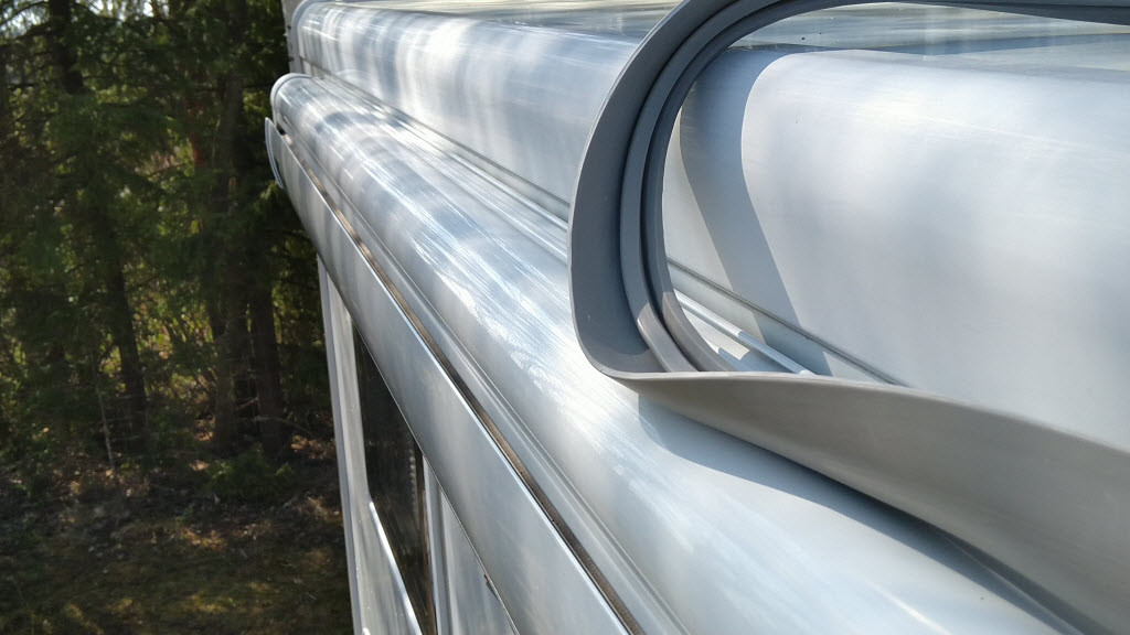 Liekö koskaan, ainakaan kunnolla, alta pesty. Päälipuoli oli suht. hyvä, mutta alapuolelle oli muumioitunut kaikenlaista - varmasti kelattu märkänä kiinni, ja seuraavana kesänä avattu seuraavan kerran. Viimeinen metri seinän puolelta vaati aika kovaa jynssäystä, Toivottavasti tömäkät pesuaine ph:t ei liottanut kaikkea muovin pehmikkeitä pois.. puhdasta tuli. Yön yli kuivamassa - katotaan aamulla menetykset  ;D