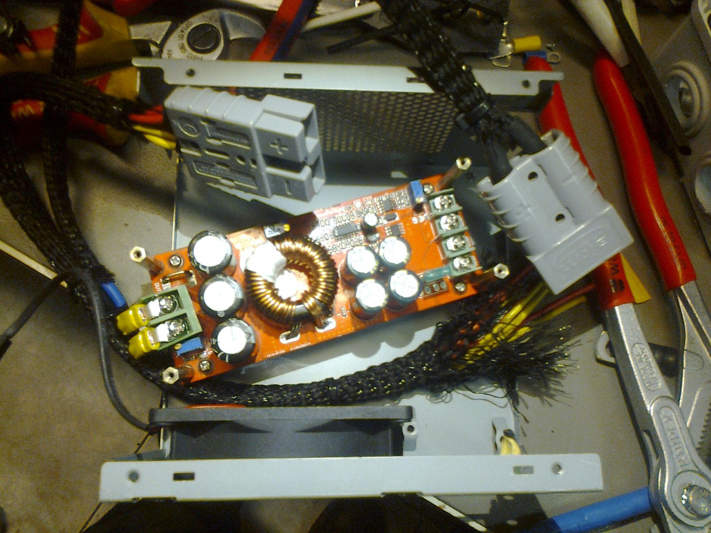 Tulipas rakenneltua 30A latausboosteri vanhaan PC:n virtalähteen koteloon. Hakkurimoduuli on Ebaysta, maksoi n. 15 euroa.