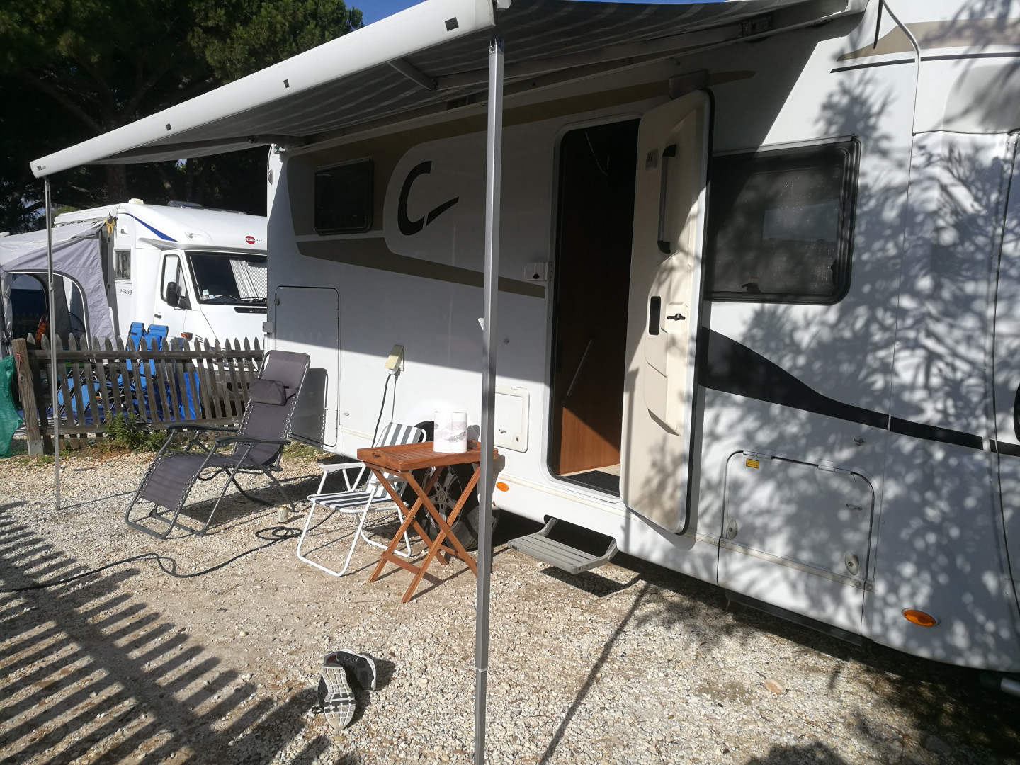 Yksi parcella koko alueella oli vapaana. Onneksi aika hyvä, arska paistaa koko päin. Todettu että auton akku pitää ostaa nopealla aikataululla. Pyörittää laiskasti ja ohjauspaneelissakin oli eilen illalla indikaattori keltaisella parin tunnin radion kuuntelun jälkeen. Vaikka paneeli lataa myös ajoakkua. ![]() Pikkuhiljaa kannettu tavaraa uuteen kulkineeseen. Tarkan inventaarion kautta joka tavara. Paljon on turhaa romua ollut vuosia mukana.