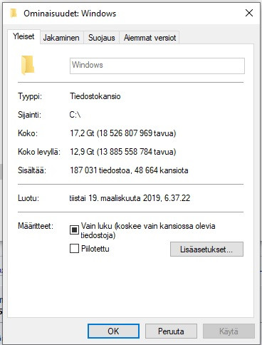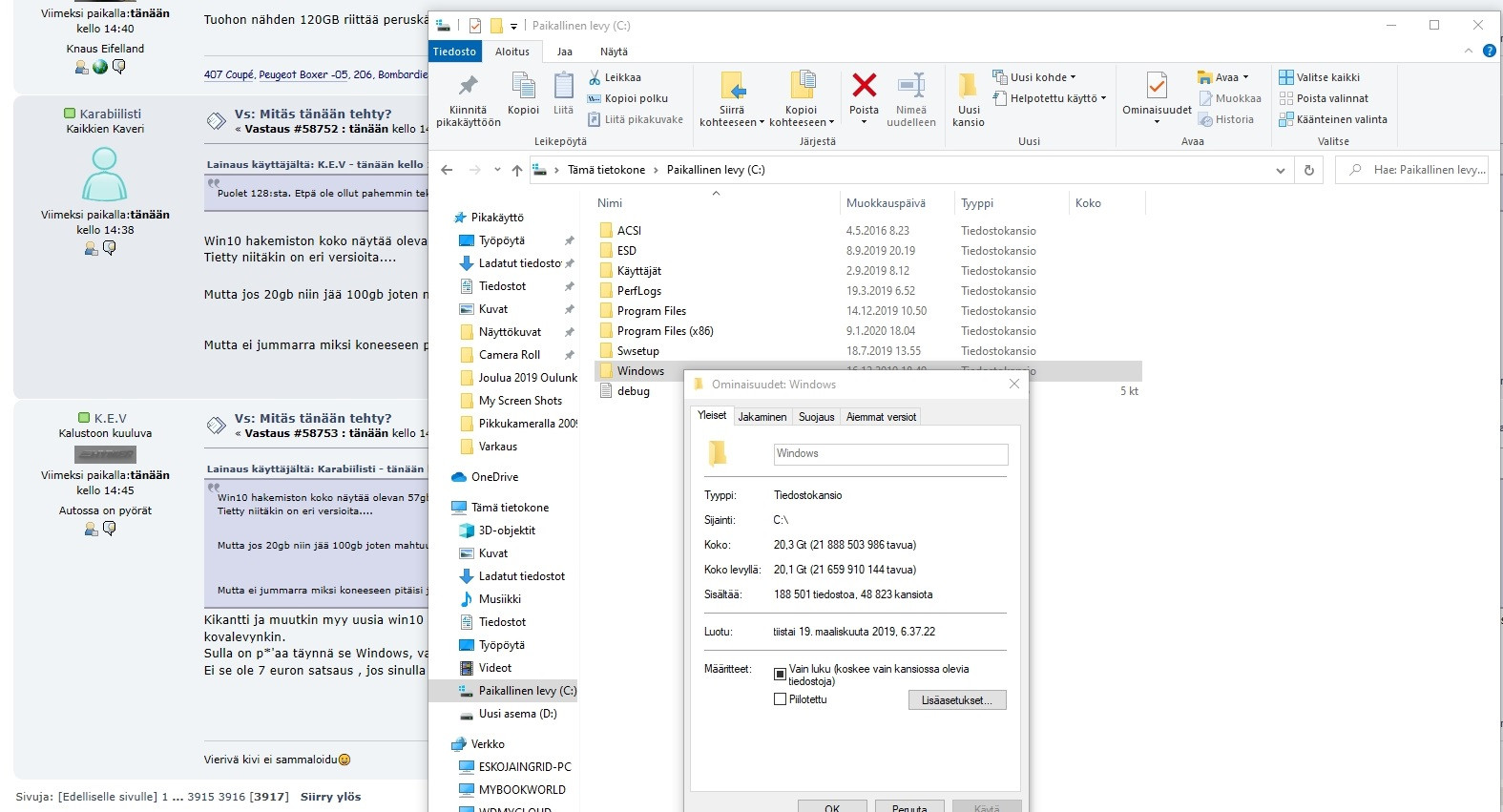 Win10 hakemiston koko näytää olevan 57gb eikä siellä ole mun omia tallennuksia.