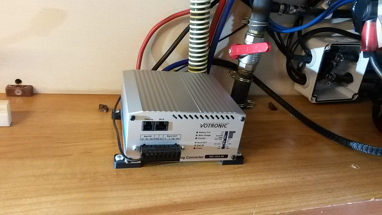 Laitettu 50A DC-DC- laturi. Tästä on sekin hyöty, kun kaapin siirtää vaunun akun perään, saa vastukselle 14 voltin päälle jännitteen, niin saa täyden kylmätehon akkuvirrallakin.