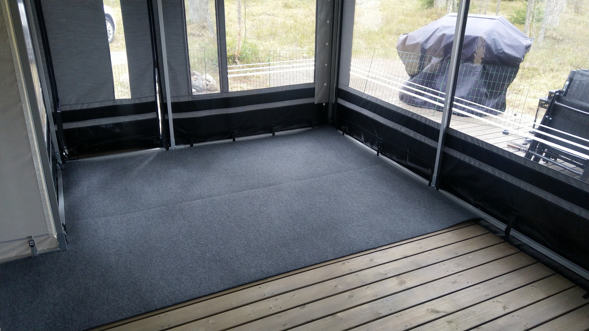 Laitettu etutelttaan matto. (Kuvassa homma vielä kesken.)