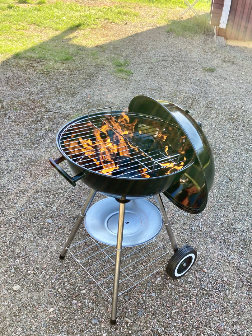 Kasasin aamutuimaan kenkätelineen mökin eteiseen. Sitten kaffen jälkeen antenniasennusta wanhojen haravien tilalle aktiiviantenni. Alkoi peruskanavat näkymään mukavasti. Sitten kaupoille noutamaan hiiligrilli. Edullisin pallo mitä löytyi. Väliin myöhäinen lounas sekä grillin kasaa ja kokoa sulkeiset. Ensin tosin pitkä hörppy asennusjuomaa. Yksi vain ja tuotapikaa ensisavun paikka.