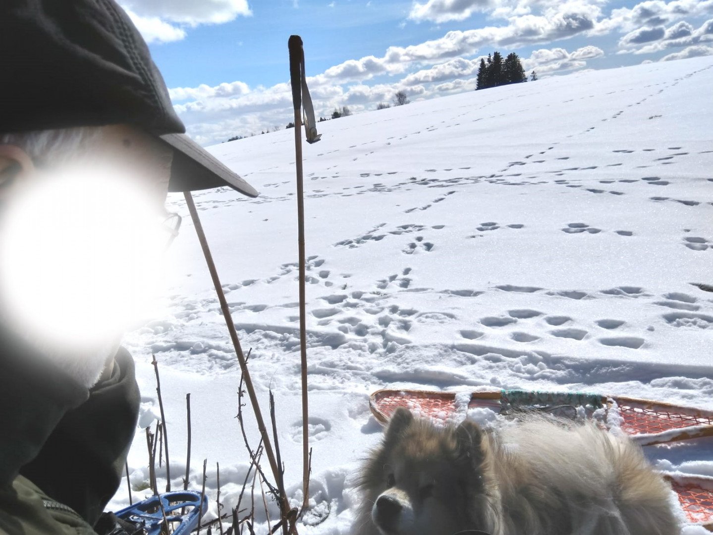 Poron kanssa paineltiin läskillä pitkin hankia 8.5km - hiihtoladuista oli vain haituvia jäljellä. Kerran piti ottaa pannut kun ei ole nastoja. Etupää lähti omille teilleen...