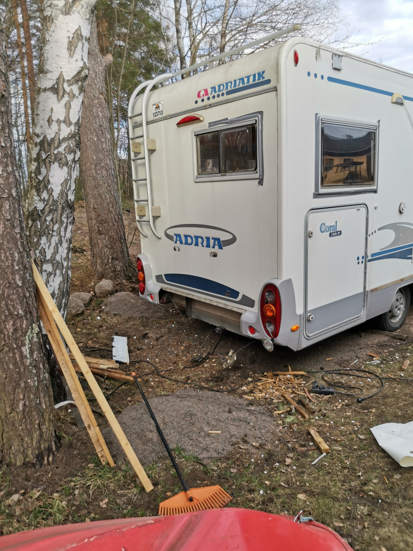 Ajettu kulkine pihasta telttaan kun alkaa vesisade.