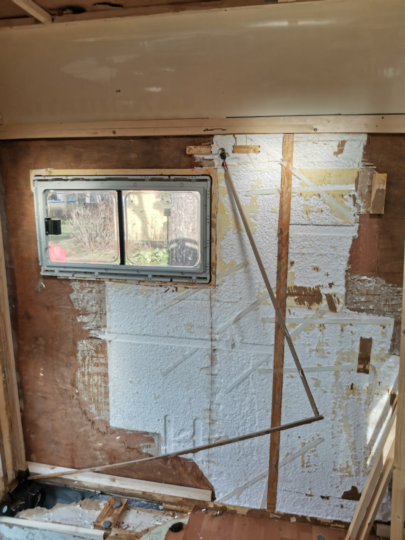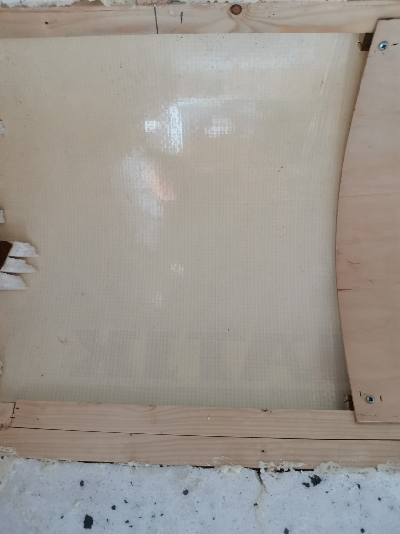 Aattelin ett sillä pääsisi helpolla, vaahtoa seinään ja levy päälle. Adria oli ratkaissut tuon 30mm styroksi suikaleilla, jotka oli liimattu levyyn, eilen laitoinkoe mielessä 4mm vanerin ottamaan muotoa, pysyi jo kaarevana