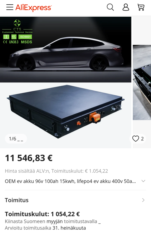 Mietin että optimiolosuhteissa riittäisi ehkä 15 kWh akku? Mitä painaisi moinen? No alibaabasta löytyi (ei tommosia mistää suomesta edes saa) ja sitä painoa oli teknisissä tiedoissa 140kg.