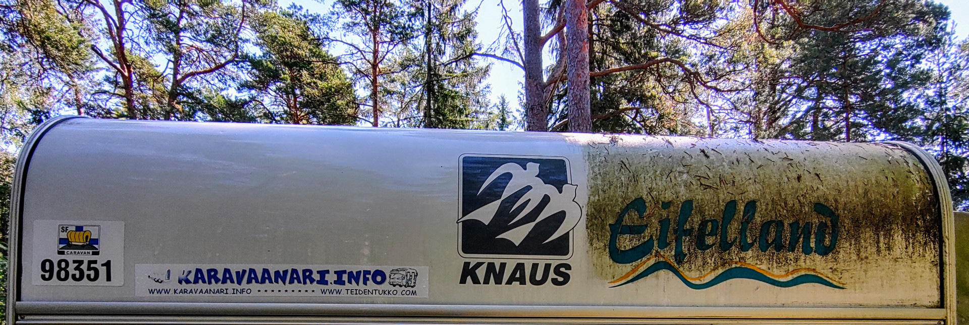 Pinelinellä ja Kärcherin akkupesurilla pesin vaunun etu- ja takaseinän ja toisen pitkän sivun. Teltan puolelta vain pikku pätkän.