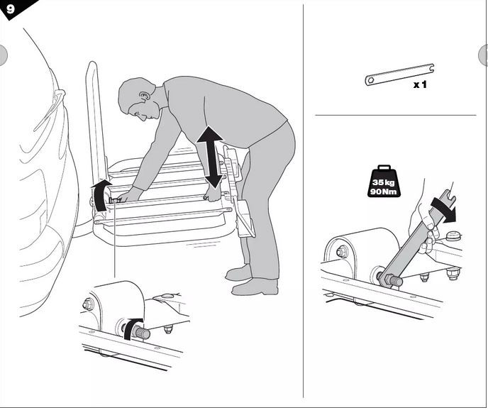 Niin ton mukaan kiristetään n.9kg-m  ja telineeseen saa laittaa 35kg kuormaa  (ilmeisesti)