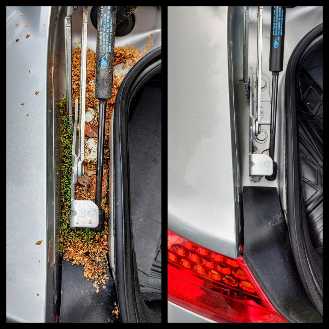 Joka paikka täynnä koivunsiementä. Keväällä viimeksi putsannut takakontin reunustat puhtaaksi, nyt siellä kasvoi jo jotain ituja...  :o
