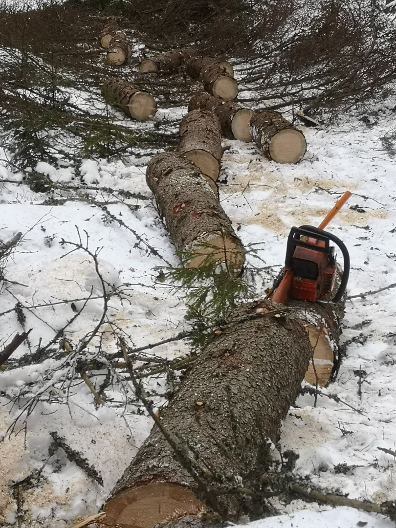 Syksyn lannerangan murtuman jälkeen ekaa kertaa kesäterässä olevan moottorisahan kanssa liikkeellä.
