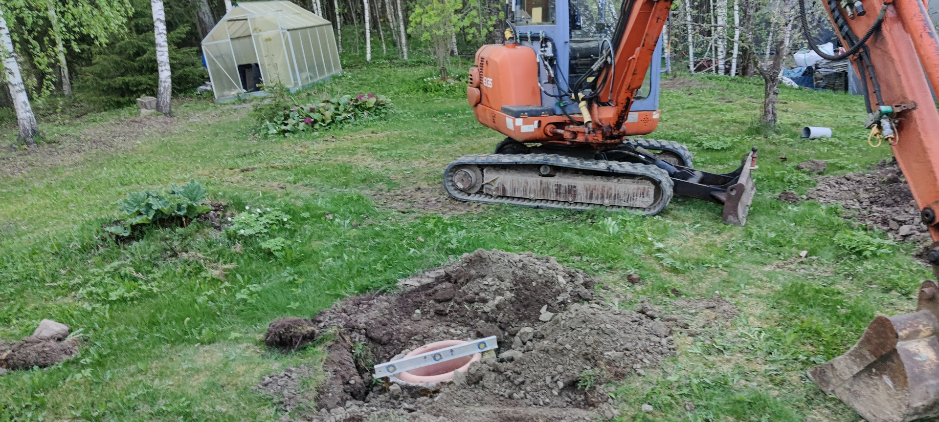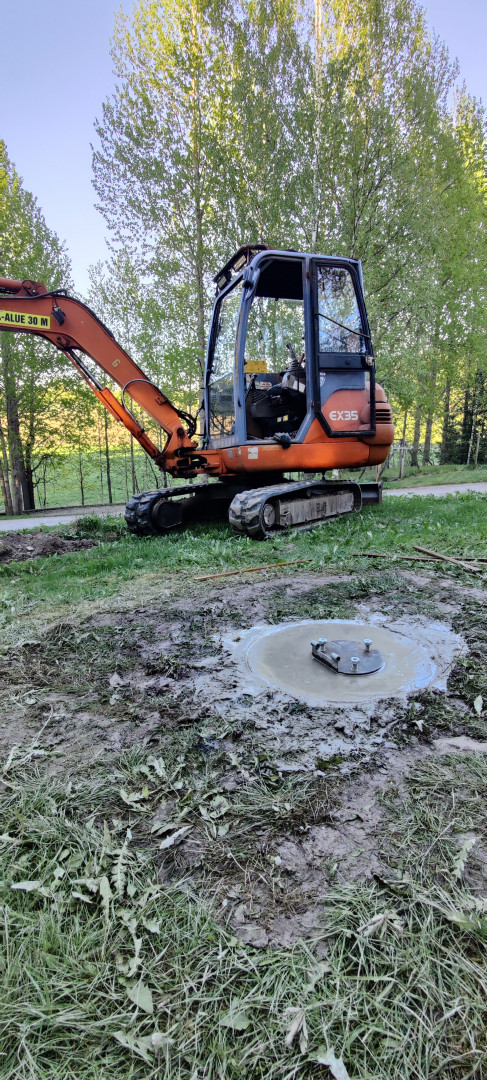 Eilinen meni suurelta osin pitkään käyttämättömän betonimyllyn laakerin elvyttämiseen, sitten vanhoja jarrulevyjä hitsailin kierretankoihin ja vähän harjaterästäkin 500x1000 mm betonirumpuputkeen, joka kuoppaan pystyyn - 140 litraa kuraa päälle.
